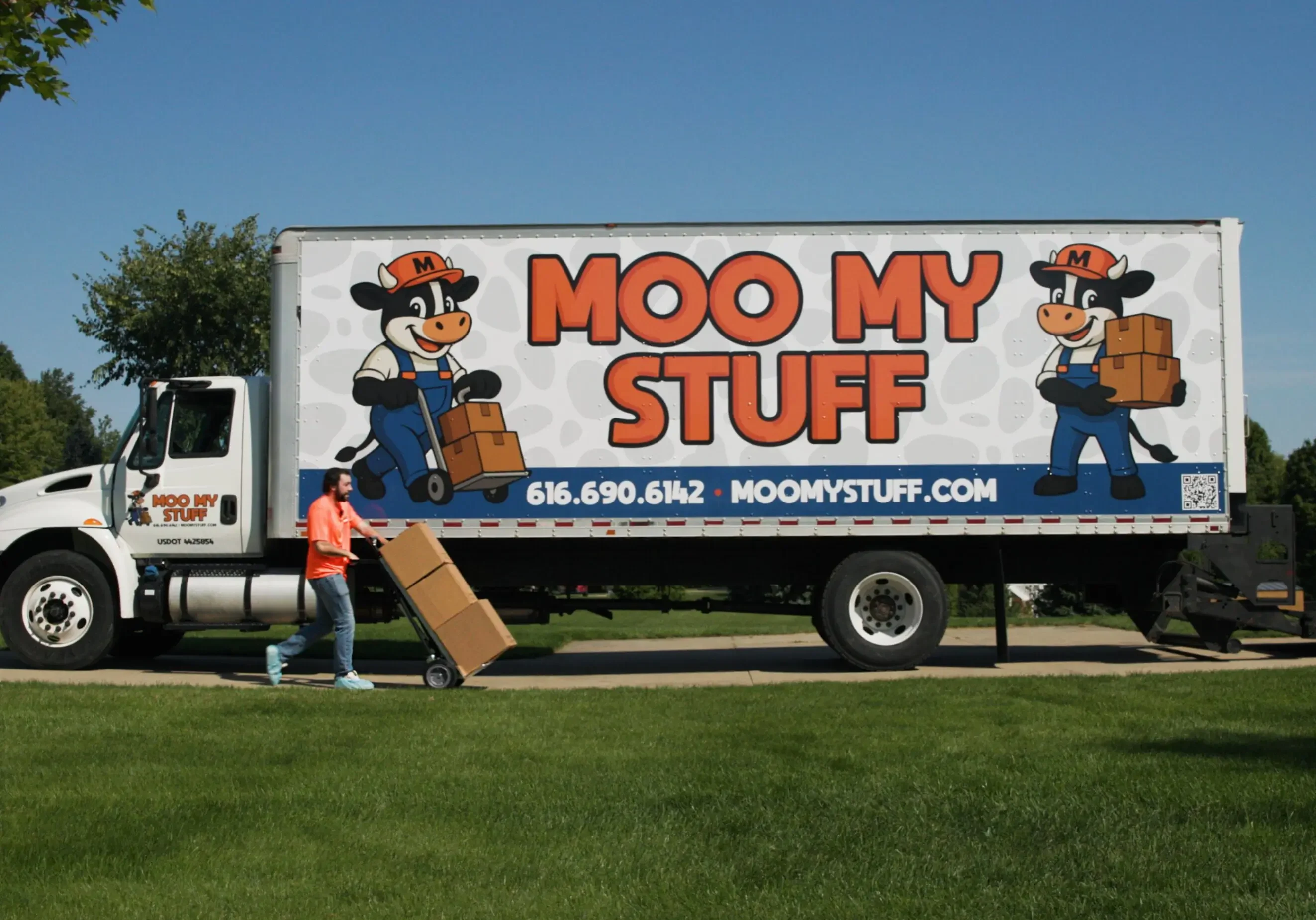 Moving truck with cartoon farmer and bold "Moo My Stuff" logo.